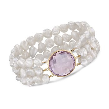 Our glamorous 7-8mm cultured freshwater keshi pearl and 18.00 carat amethyst bracelet features three rows of pearls gathered with a bezel-set gemstone. Stretches to fit most wrists. Bracelet is presented with 14kt yellow gold. Amethyst birthstones are the perfect gift for February birthdays.You will not be disappointed with 7-8mm Keshi Pearl, 18.00ct Amethyst Bracelet, Gold. Adjustable Size