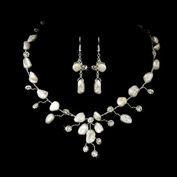 Lovely and enchanting, this silver plated necklace and earring set features keshi freshwater pearls and clear rhinestones in a floral and vine design. This beautiful set makes the perfect accessory for your wedding or special occasion and will coordinate wonderfully with any dress. The necklace features a lobster claw clasp.You will not be disappointed with Silver Keshi Pearl Bridal Necklace Earring Set